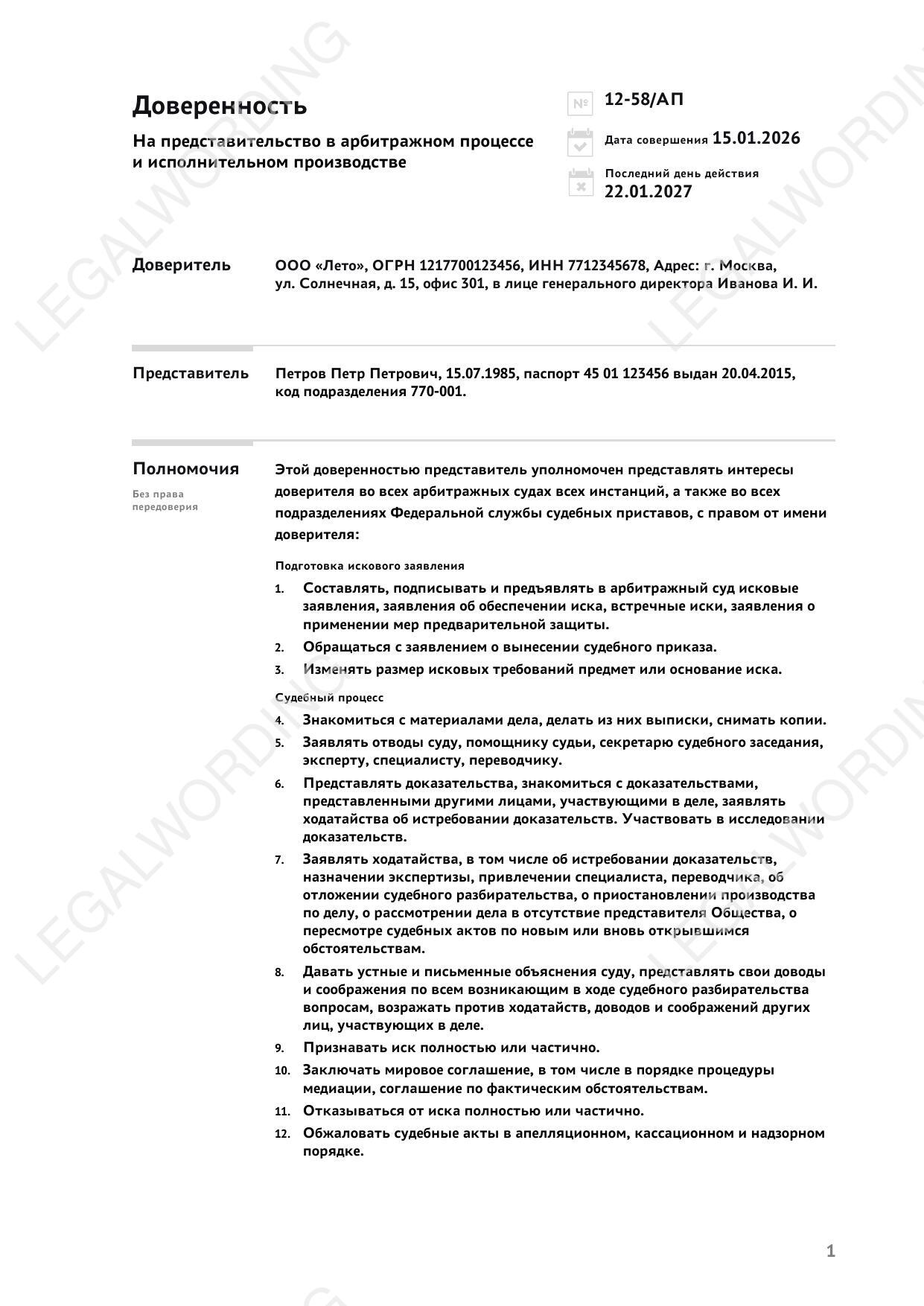 Шаблон универсальной доверенностьи с выделенной визуальной частью и составленная по принципам Legal Design. Документ сотавлен для работы, как типовая доверенность для организации.