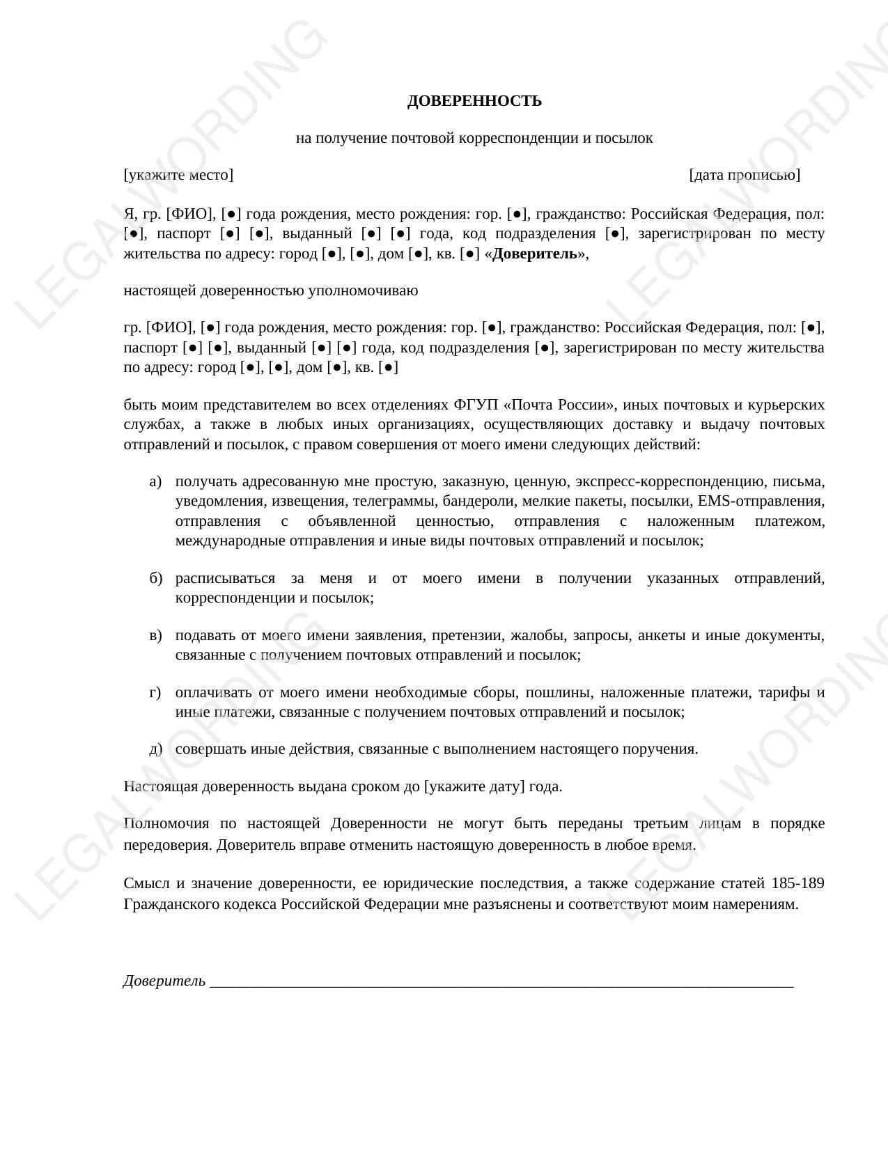 Доверенность на получение почтовой корреспонденции и посылок – это юридический документ, который позволяет доверенному лицу получать письма, посылки и иные почтовые отправления от имени доверителя.