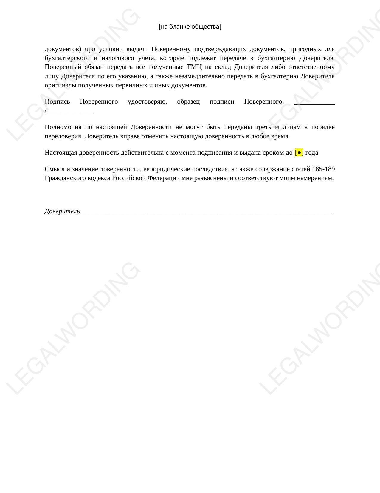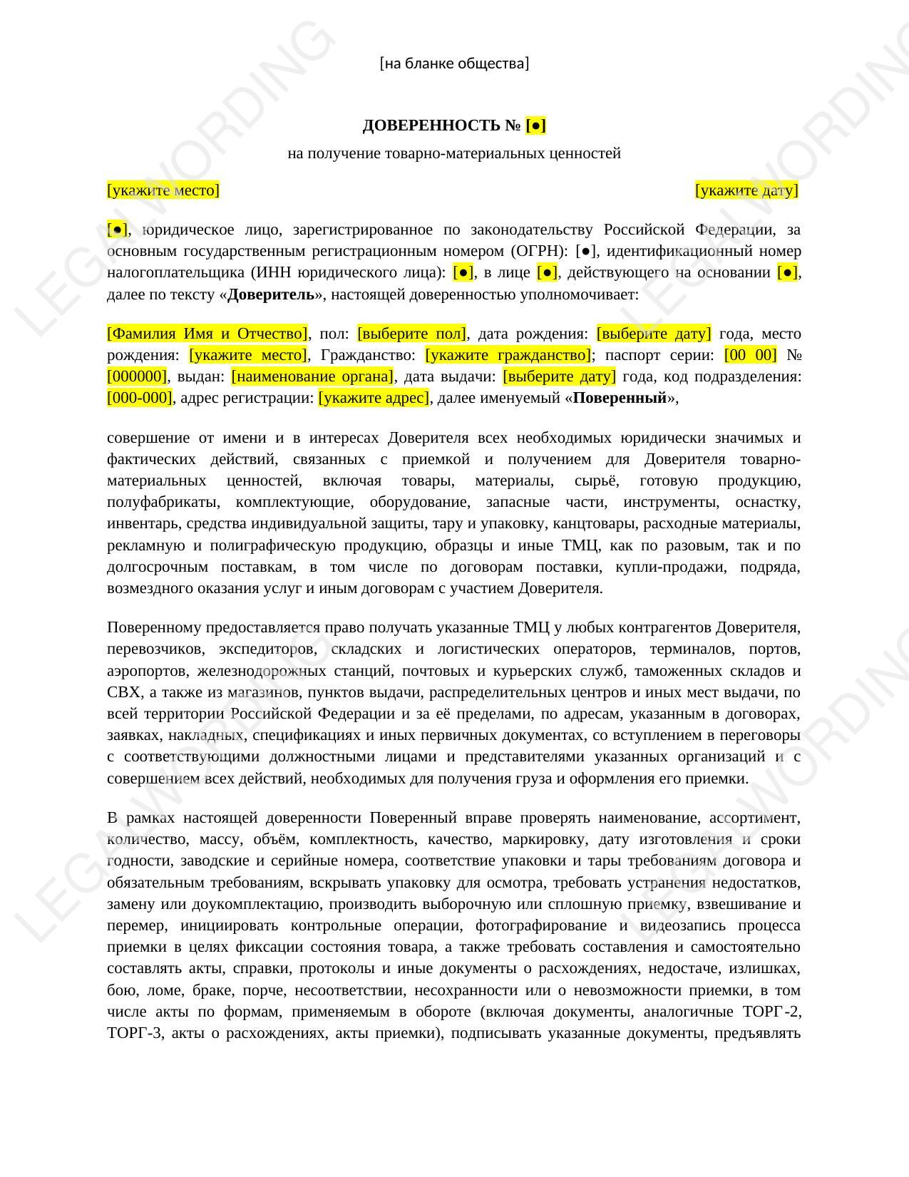 Доверенность на получение товарно-материальных ценностей (ТМЦ) — которой компания уполномочивает сотрудника, курьера или экспедитора принимать и вывозить ТМЦ у поставщиков, перевозчиков, складов и терминалов.