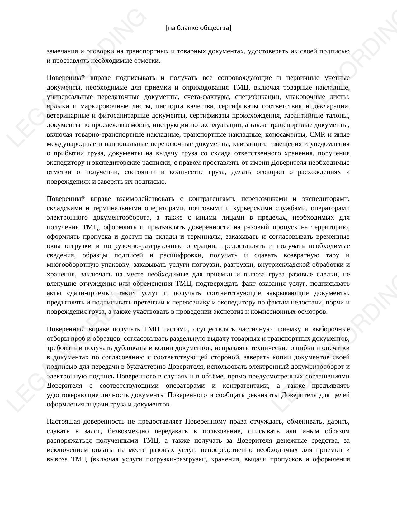 Шаблон содержит расширенные полномочия: проверка наименования, количества, качества и маркировки; вскрытие упаковки; выборочная или сплошная приемка; составление актов (в т.ч. аналогов ТОРГ‑2, ТОРГ‑3), оговорки на товарных и транспортных документах; подписание первичных документов (накладные, УПД, счета‑фактуры, упаковочные листы, сертификаты) и перевозочных документов (ТТН, транспортные накладные, CMR, коносамент).