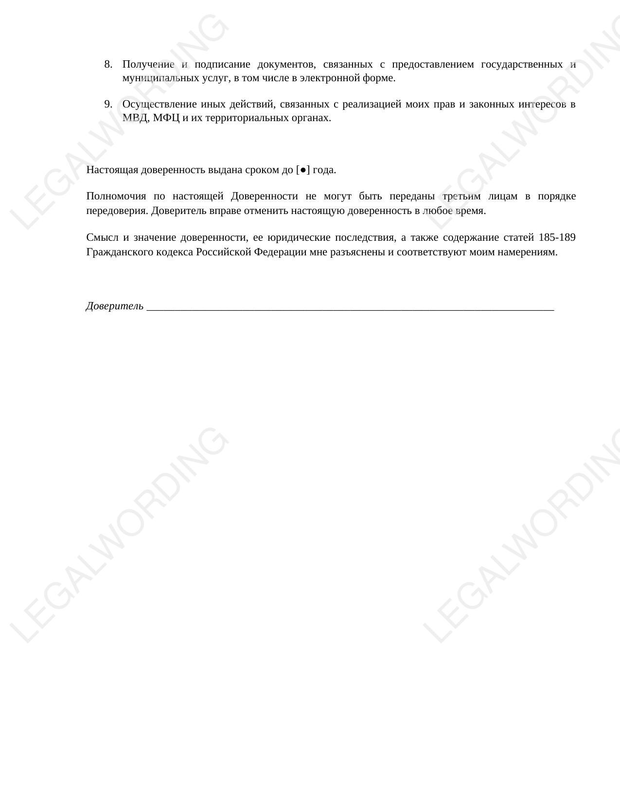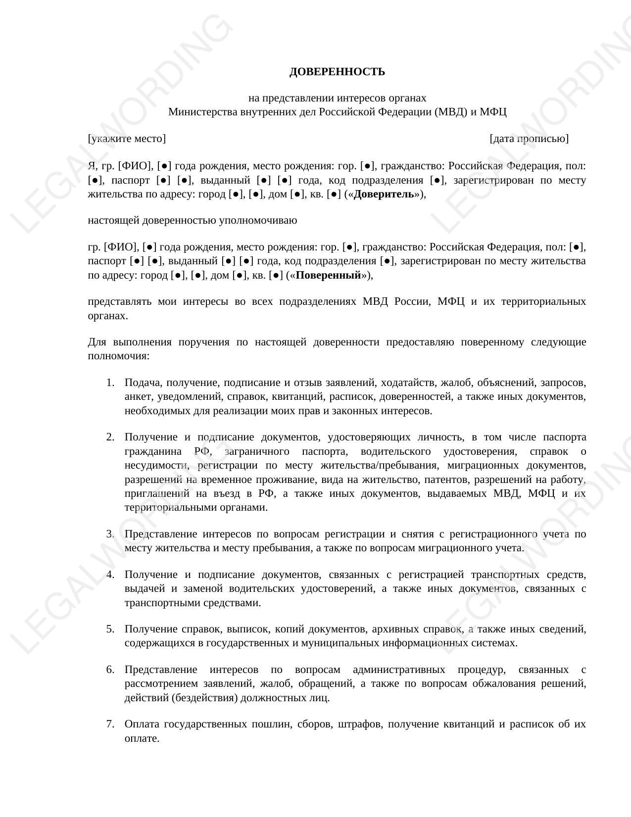 Доверенность позволяет одному лицу (доверителю) передать другому лицу (поверенному) право действовать от его имени в различных государственных и муниципальных органах, включая МВД и МФЦ.