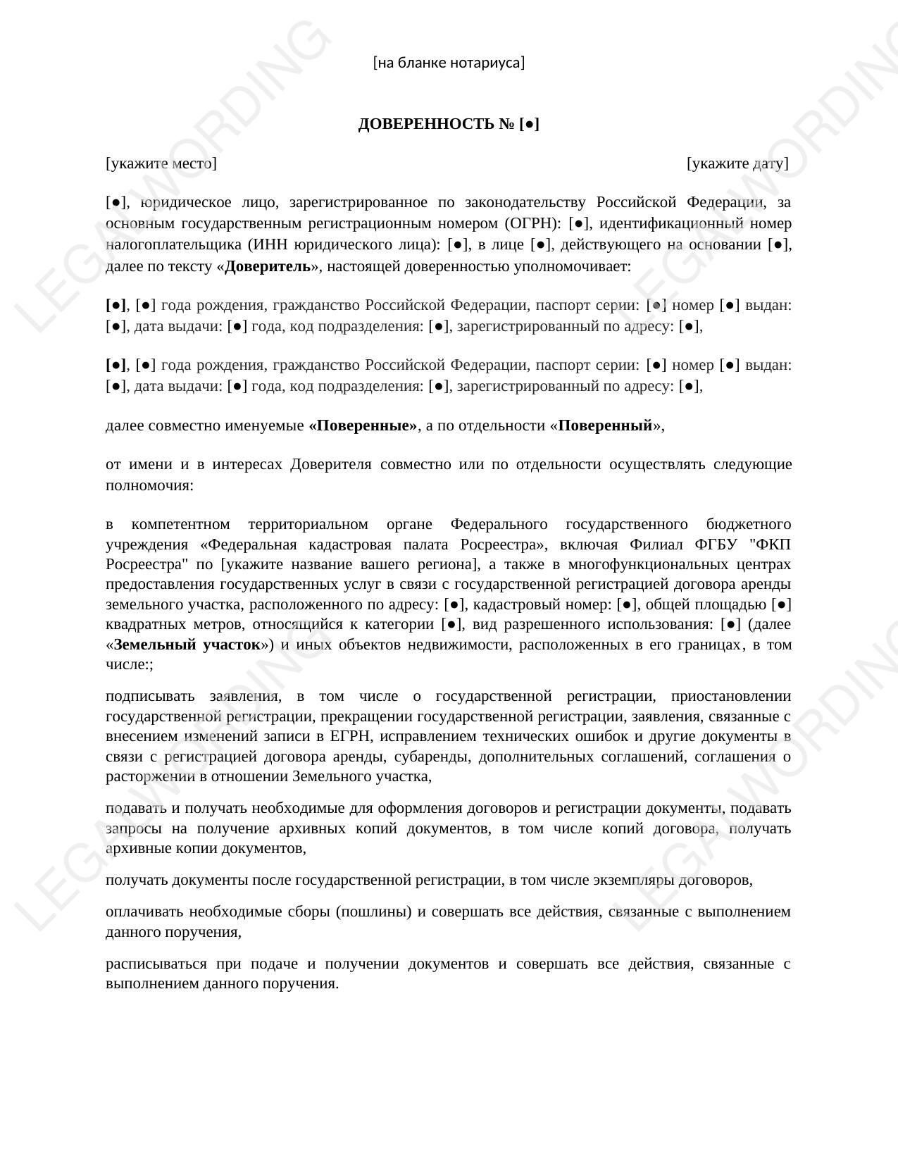 Данная доверенность позволяет уполномоченным лицам (Поверенным) представлять интересы юридического лица (Доверителя) при государственной регистрации договора аренды земельного участка в Росреестре.