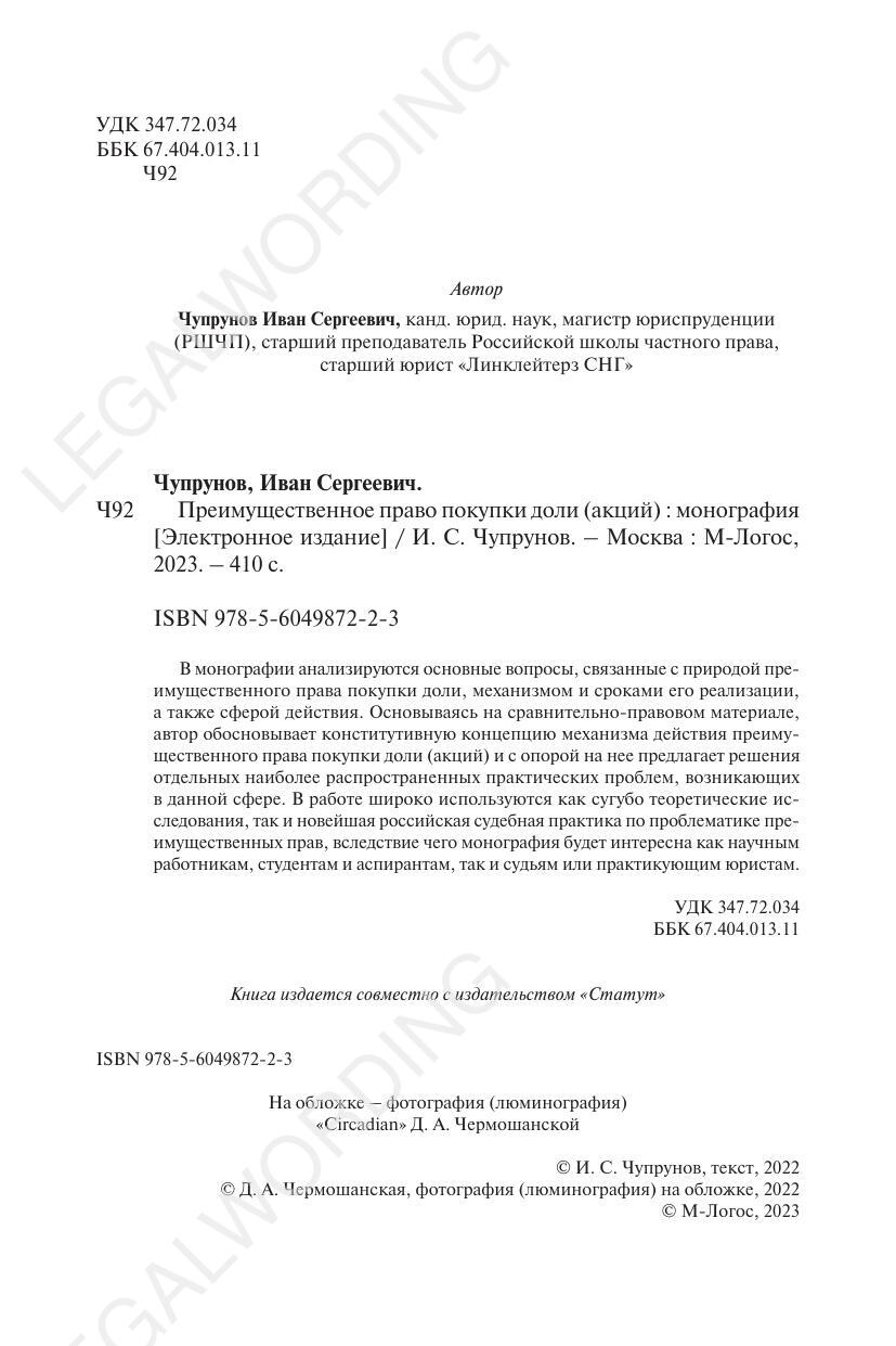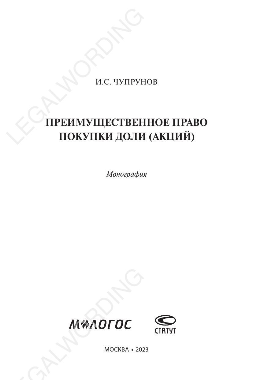 Выходные данные: Чупрунов, Иван Сергеевич. Преимущественное право покупки доли (акций) : монография [Электронное издание] / И. С. Чупрунов. – Москва : М-Логос, 2023. – 410 с.