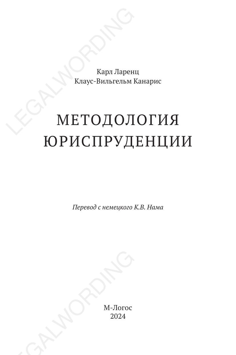 Выходные данные: Методология юриспруденции / К. Ларенц, К.-В. Канарис ; пер. с нем. К. В. Нама. – Москва : М-Логос, 2024. – 357 с. ISBN 978-5-6049872-4-7