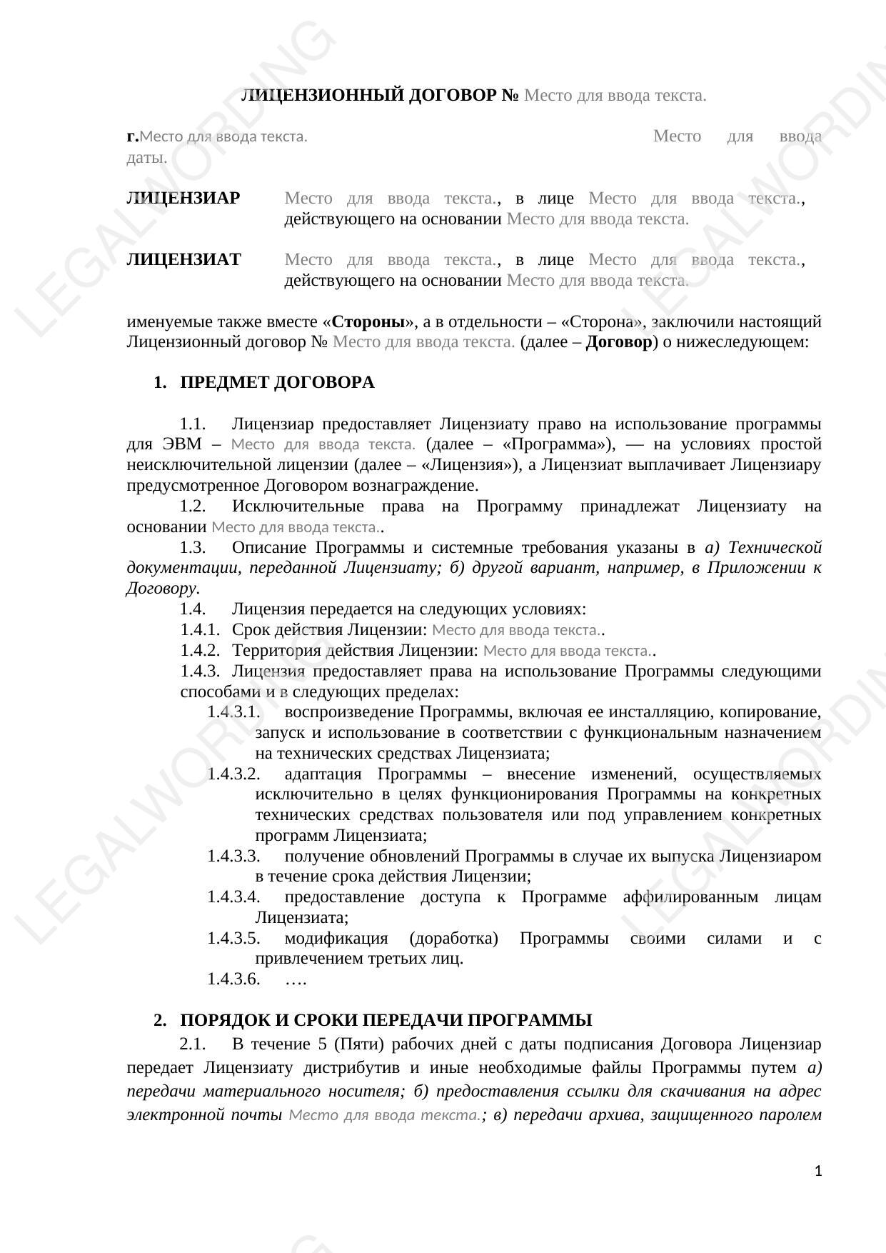 Шаблон лицензионного договора для передачи прав пользования программой для ЭВМ с передачей программы для ЭВМ для установки на устройствах Лицензиата.