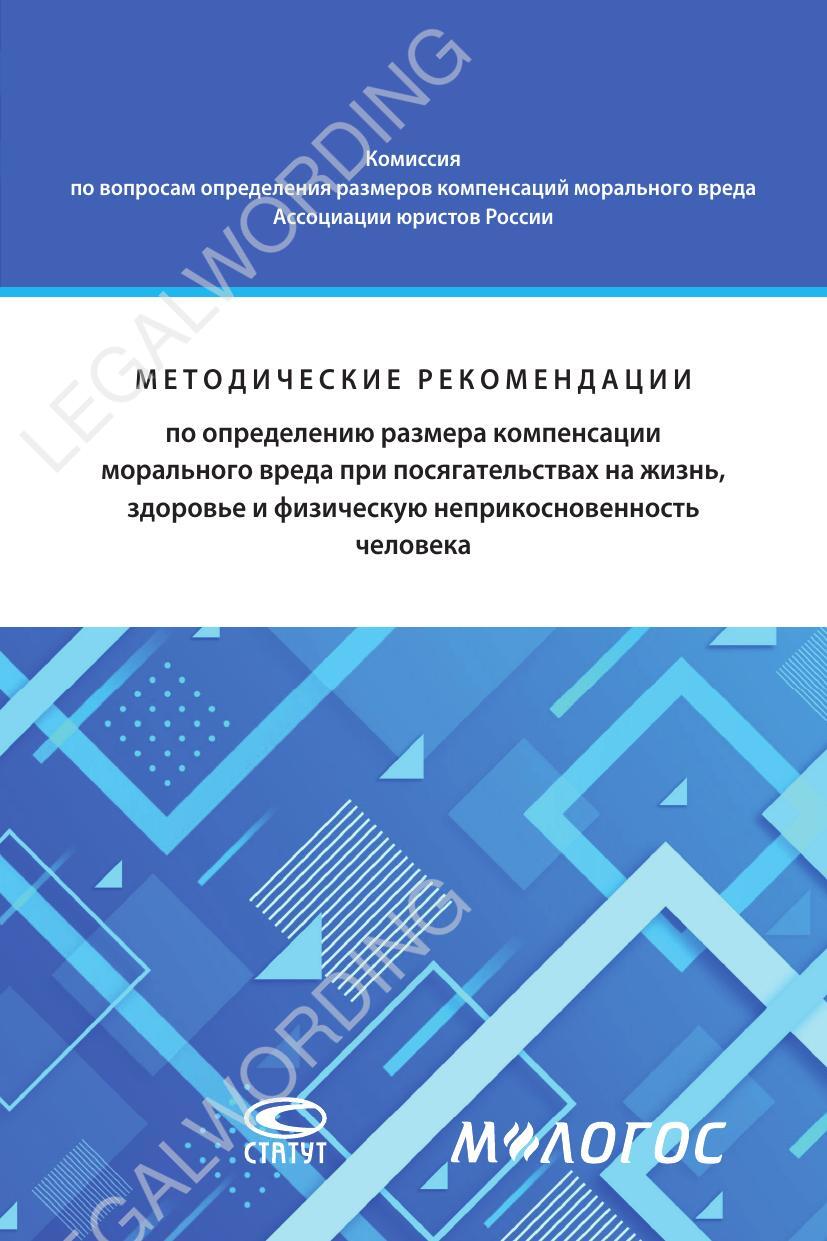 Выходные данные: Методические рекомендации по определению размера компенсации морального вреда при посягательствах на жизнь, здоровье и физическую неприкосновенность человека [Электронное издание]. – Москва : М-Логос, 2023. – 82 с. ISBN 978-5-6049872-0-9 Книга размещена на сайте Юридического института М-Логос. https://m-lawbooks.ru/