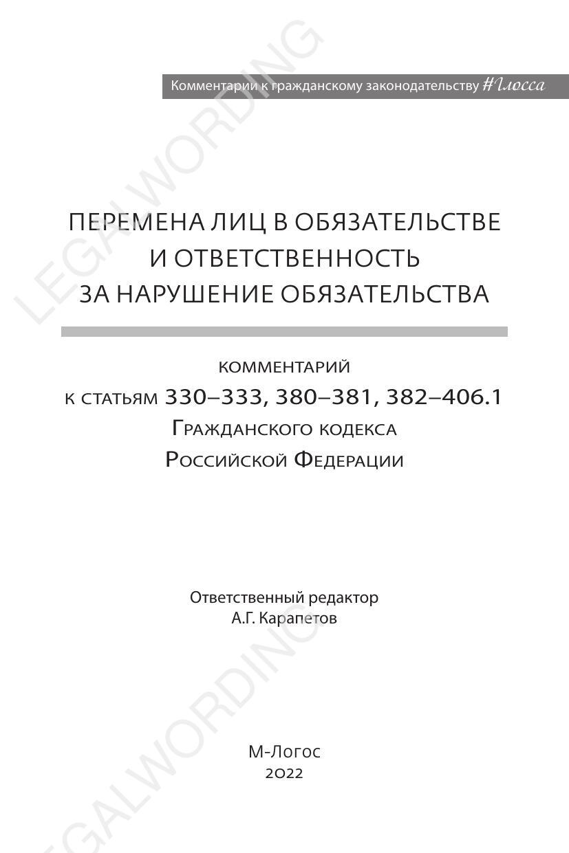 Выходные данные электронной книги: Перемена лиц в обязательстве и ответственность за нарушение обязательства : комментарий к статьям 330–333, 380–381, 382–406.1 Гражданского кодекса Российской Федерации [Электронное издание. Редакция 2.0] / Отв. ред. А. Г. Карапетов. – Москва : М-Логос, 2022. – 1582 с. – (Комментарии к гражданскому законодательству #Глосса.)