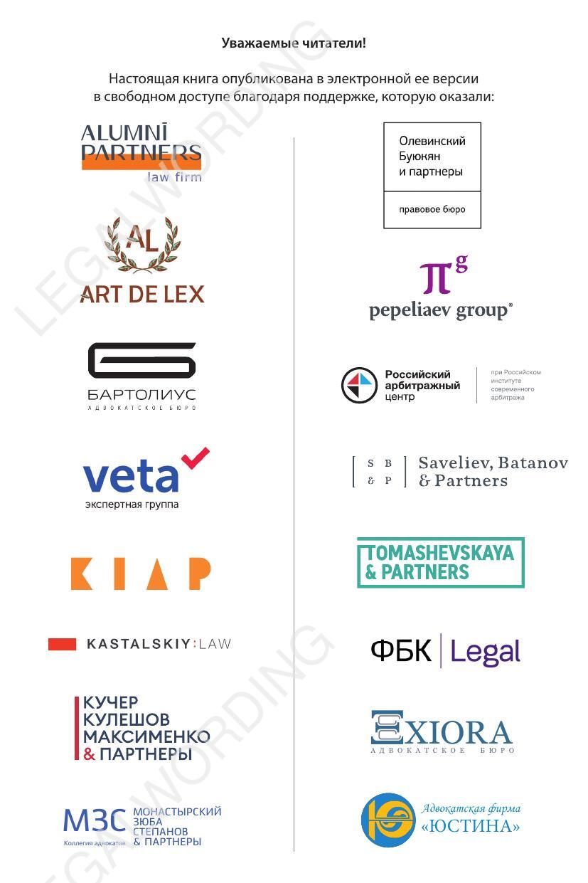 *** Электронная книга опубликована в свободном доступе при поддержке ряда юридических фирм, адвокатских образований и арбитражных учреждений: — Art de lex, юридическая фирма — Бартолиус, адвокатское бюро — Кастальский и партнеры, юридическая фирма — КИАП, адвокатское бюро — Кучер, Кулешов, Максименко и партнеры, юридическая фирма — Монастырский, Зюба, Степанов и партнеры, юридическая фирма — Олевинский, Буюкян и партнеры, правовое бюро, — Пепеляев Групп, юридическая фирма — Российский арбитражный центр при Институте современного арбитража, — Савельев, Батанов и партнеры, юридическая фирма — Томашевская и партнеры, юридическая фирма — ФБК Legal, юридическая фирма — Юстина, адвокатская фирма — Alumni partners, юридическая фирма — Exiora, адвокатское бюро — Veta, экспертная группа https://m-lawbooks.ru/