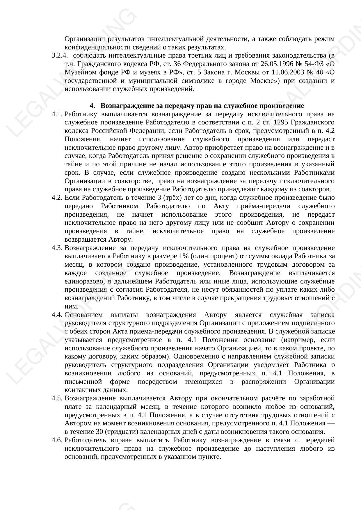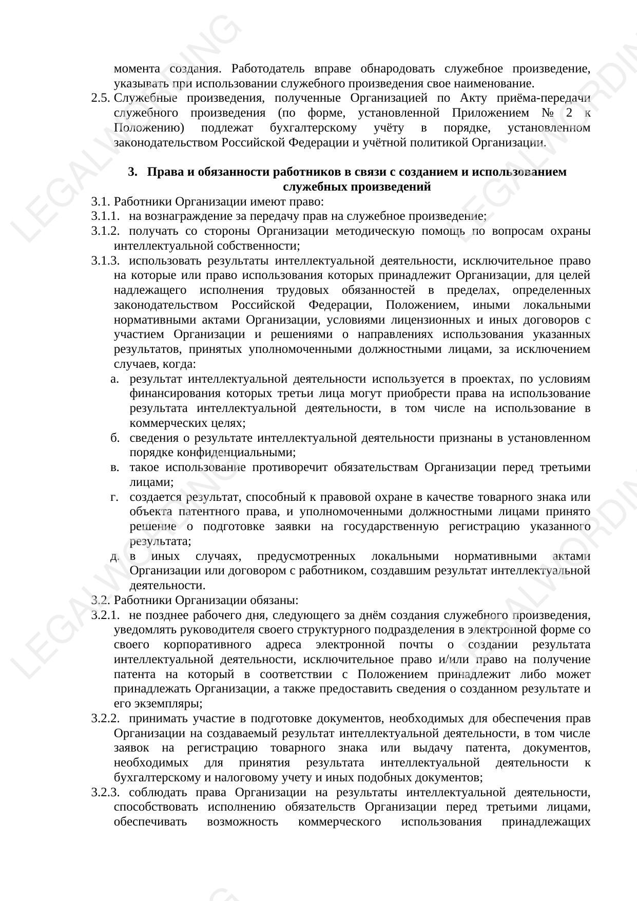 Положение устанавливает перечень объектов интеллектуальной собственности (видов служебных произведений), создаваемых работниками Организации, порядок признания произведения, являющегося объектом интеллектуальной собственности, служебным произведением, порядок перехода исключительного права на служебное произведение от работника к работодателю, порядок выплаты работнику вознаграждения. Положение снабжено приказом о его утверждении, формами служебного задания на создание результата интеллектуальной деятельности, акта приёма-передачи служебного произведения, дополнительного соглашения к трудовому договору.