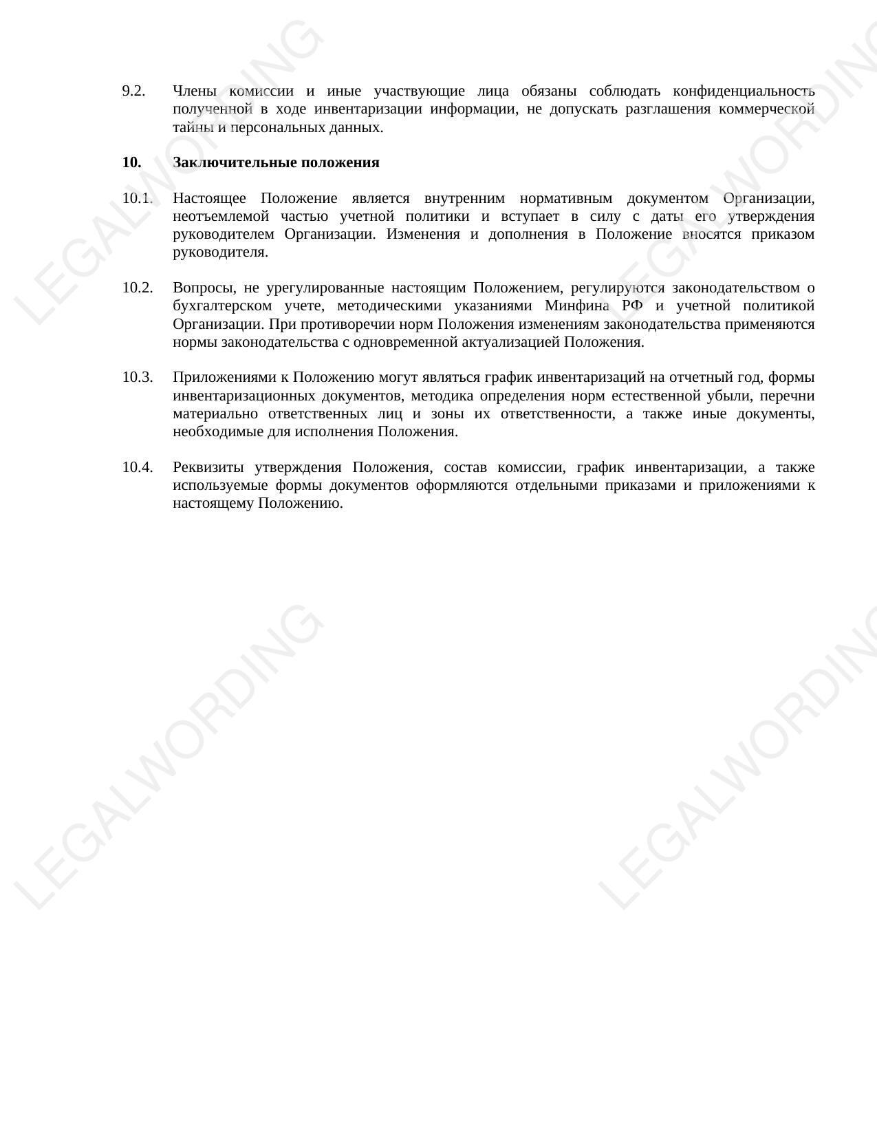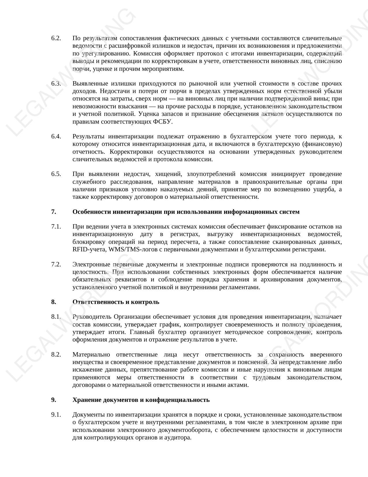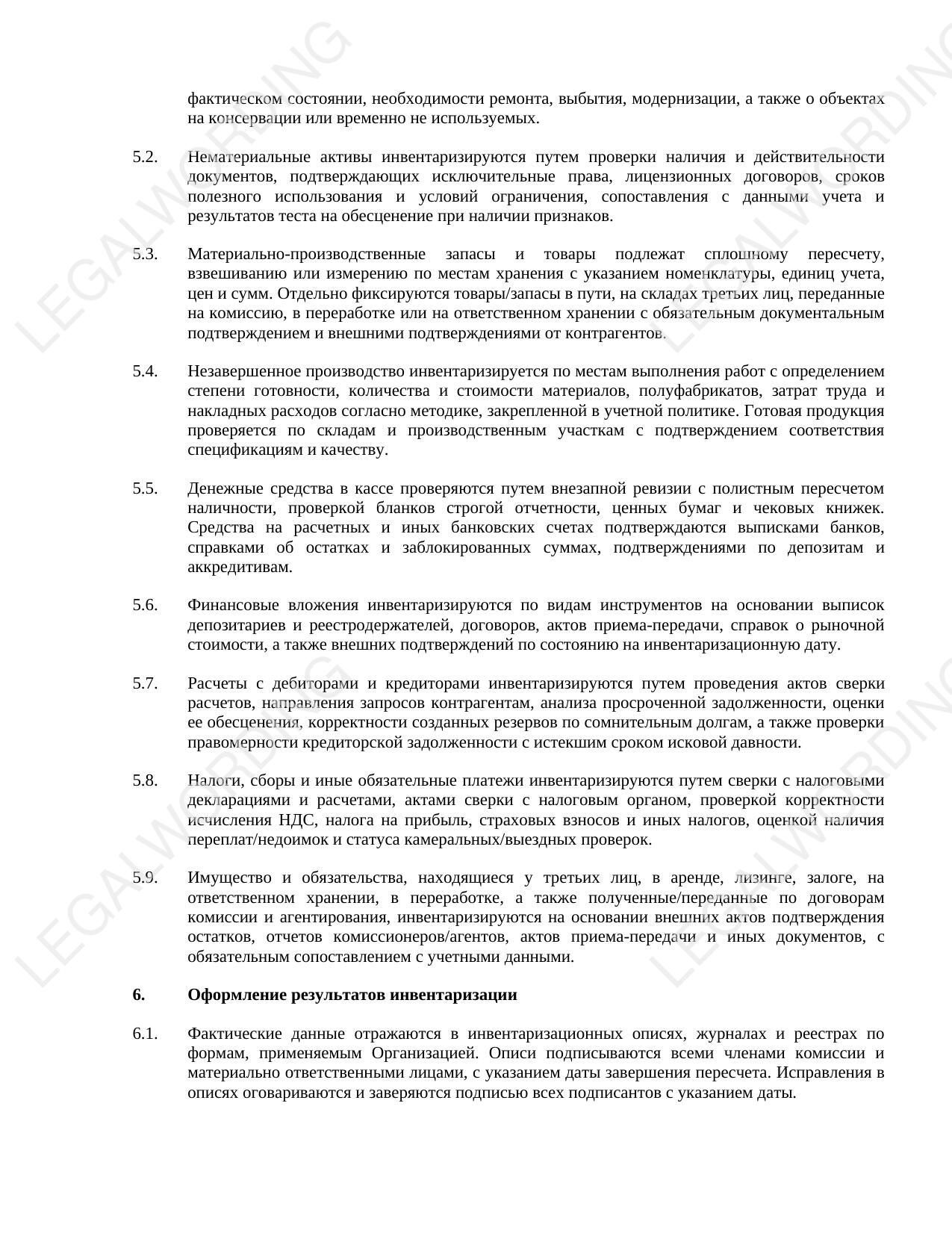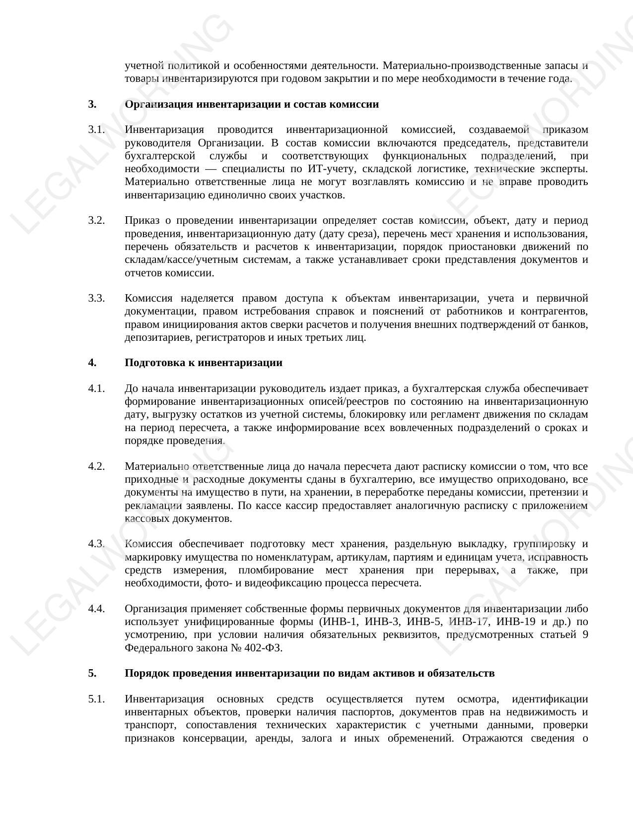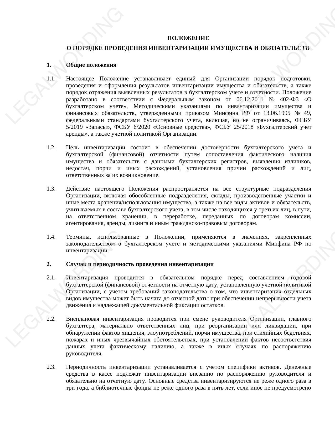 Документ регламентирует цели, случаи и периодичность инвентаризации, состав и полномочия комиссии, подготовку и порядок пересчета по видам активов и обязательств, формы первичных документов (ИНВ), правила оформления сличительных ведомостей и отражения результатов в учете в соответствии с 402‑ФЗ, методическими указаниями Минфина № 49 и ФСБУ.