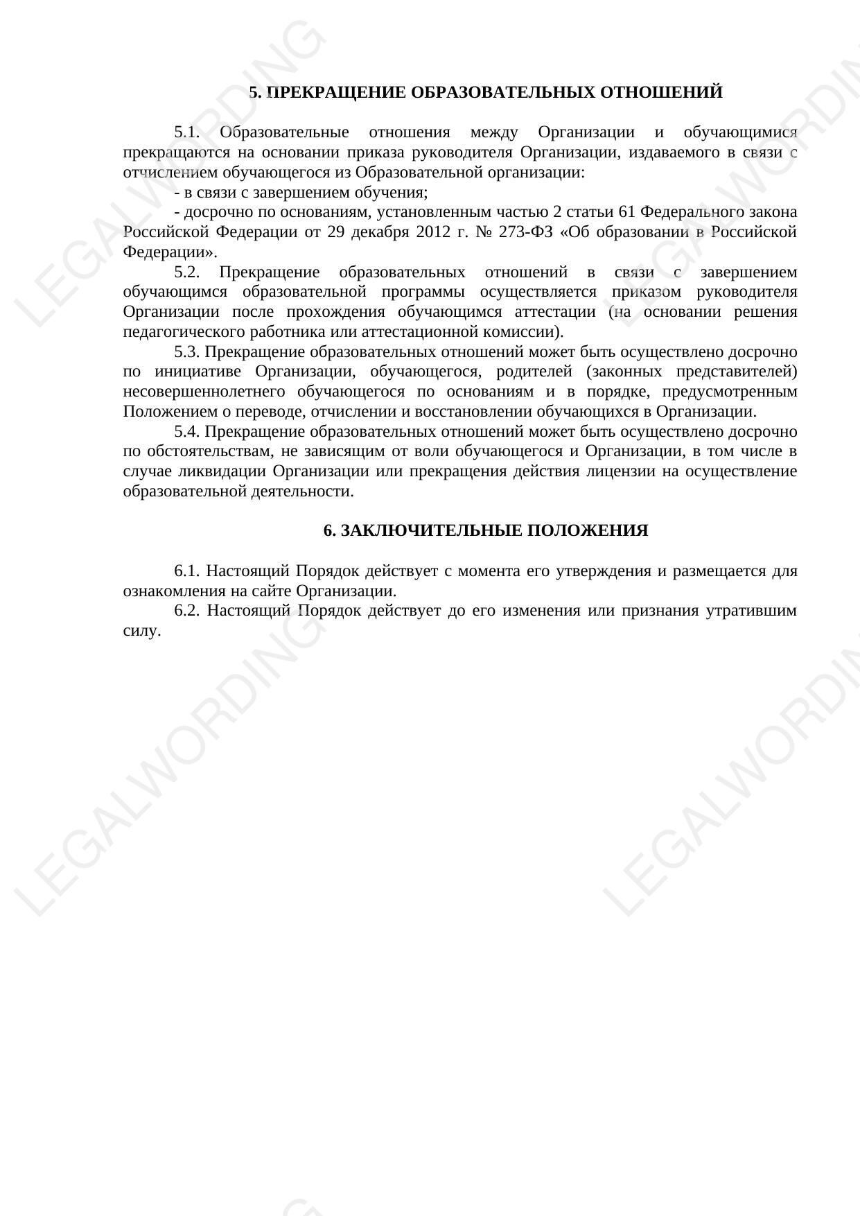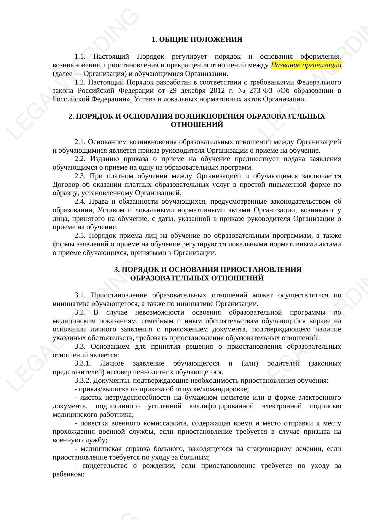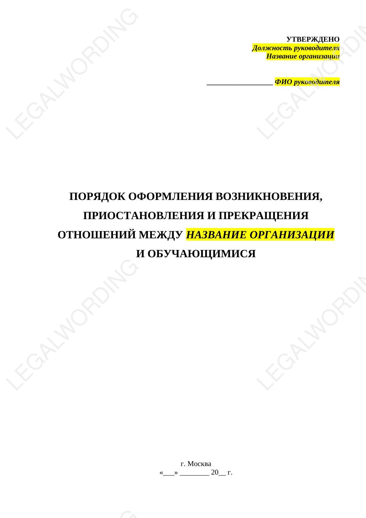 Порядок оформления возникновения, приостановления и прекращения отношений между Организацией и обучающимися и приказ о его утверждении.
