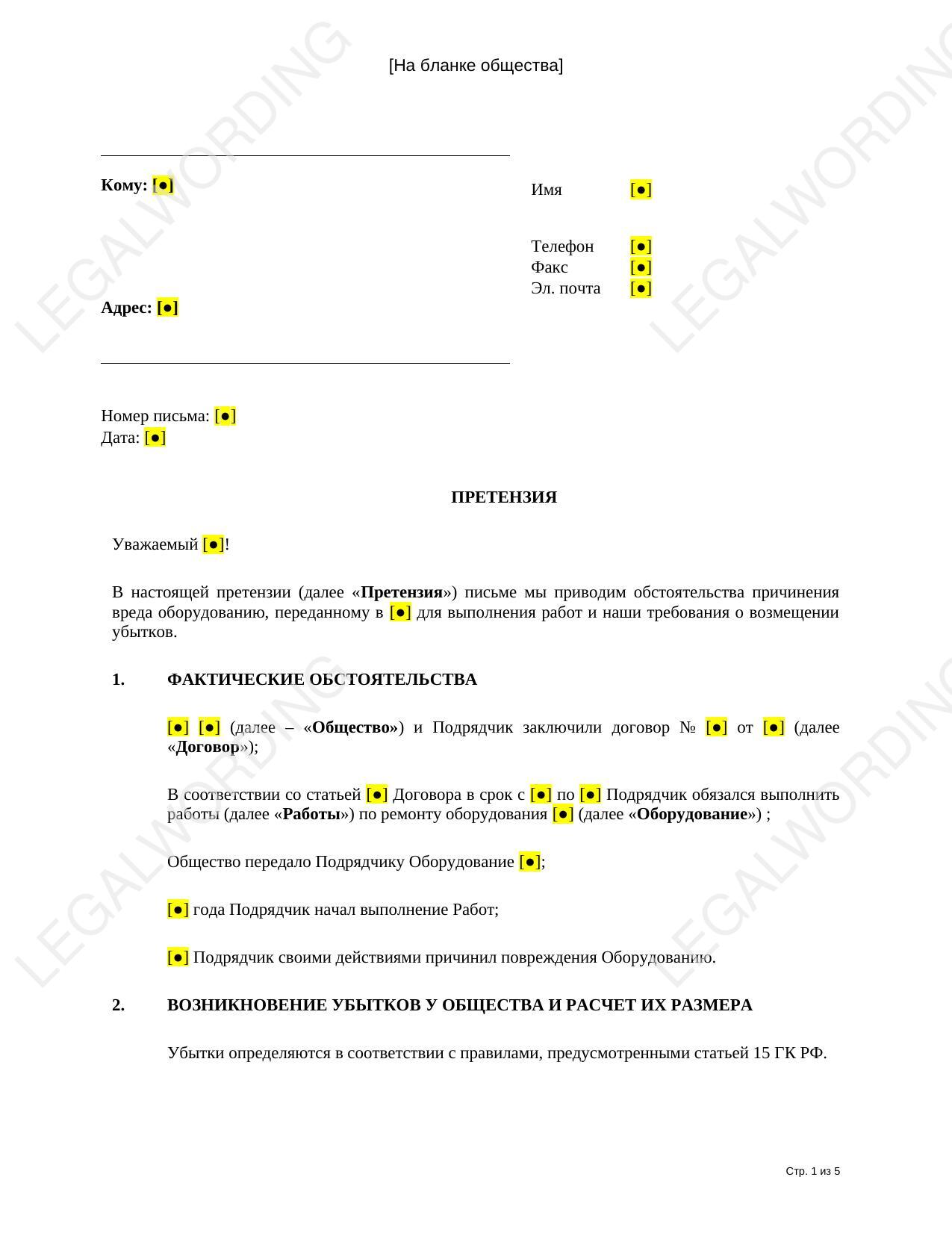 Подрядчик причинил вред оборудованию заказчика, которое взял у заказчика в ремонт. Заказчик в претензии приводит обстоятельства причинения вреда и требует возмещение убытков.