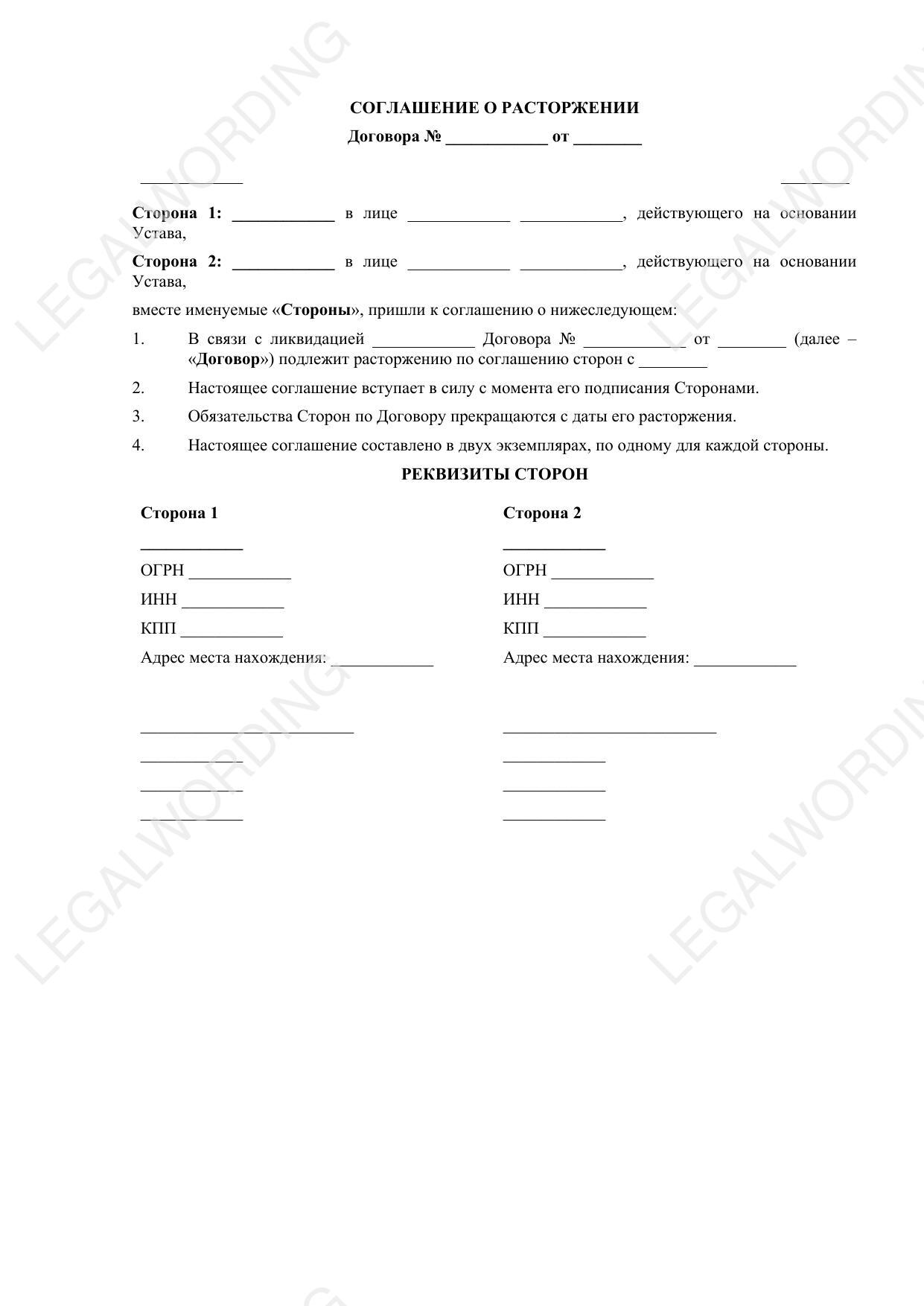 Шаблон регулирует процессы заключения и подписания соглашения о расторжении договора, описывает условия прекращения обязательств и содержит всю необходимую информацию для правильного оформления документа