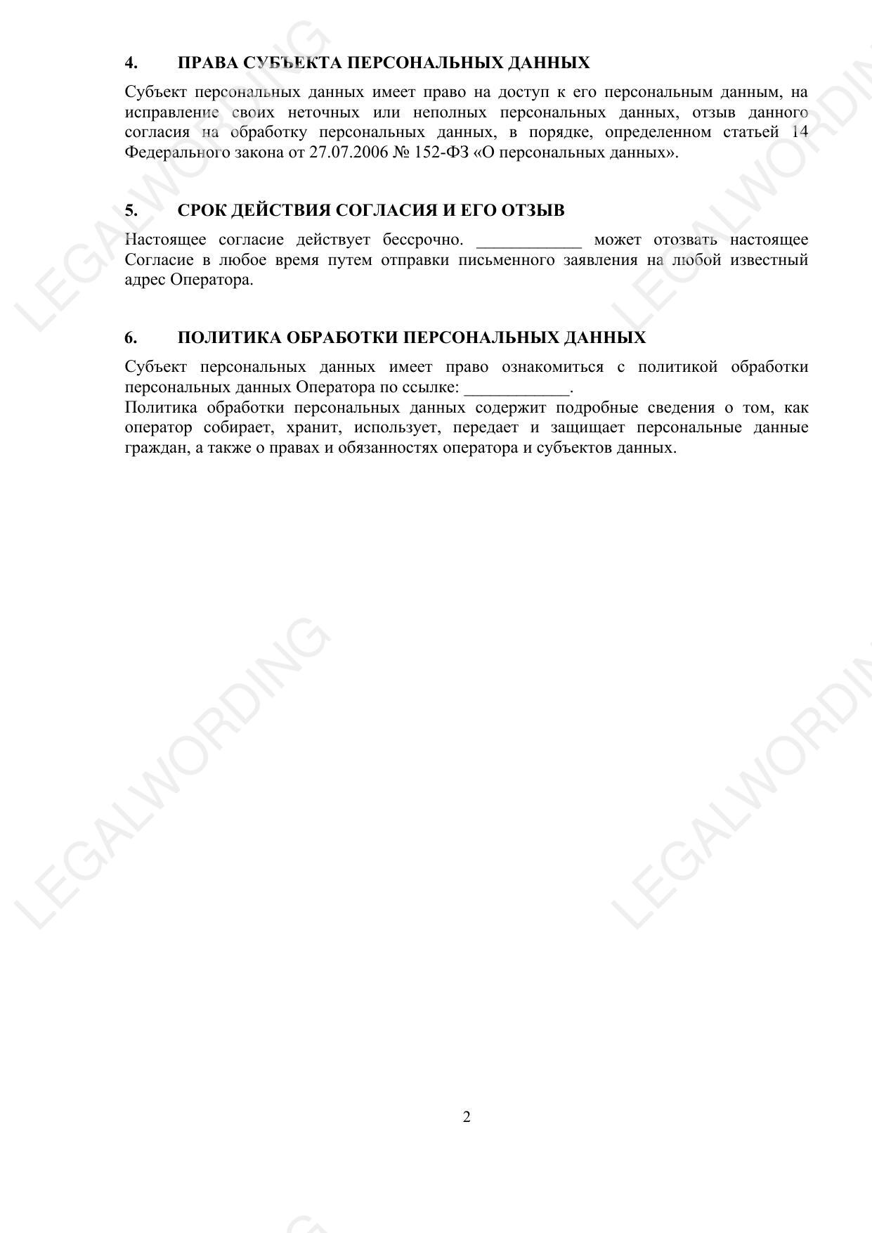 Шаблон согласия на обработку персональных данных предназначен для использования между субъектом персональных данных и оператором, обрабатывающим персональные данные. Документ включает следующие ключевые разделы: