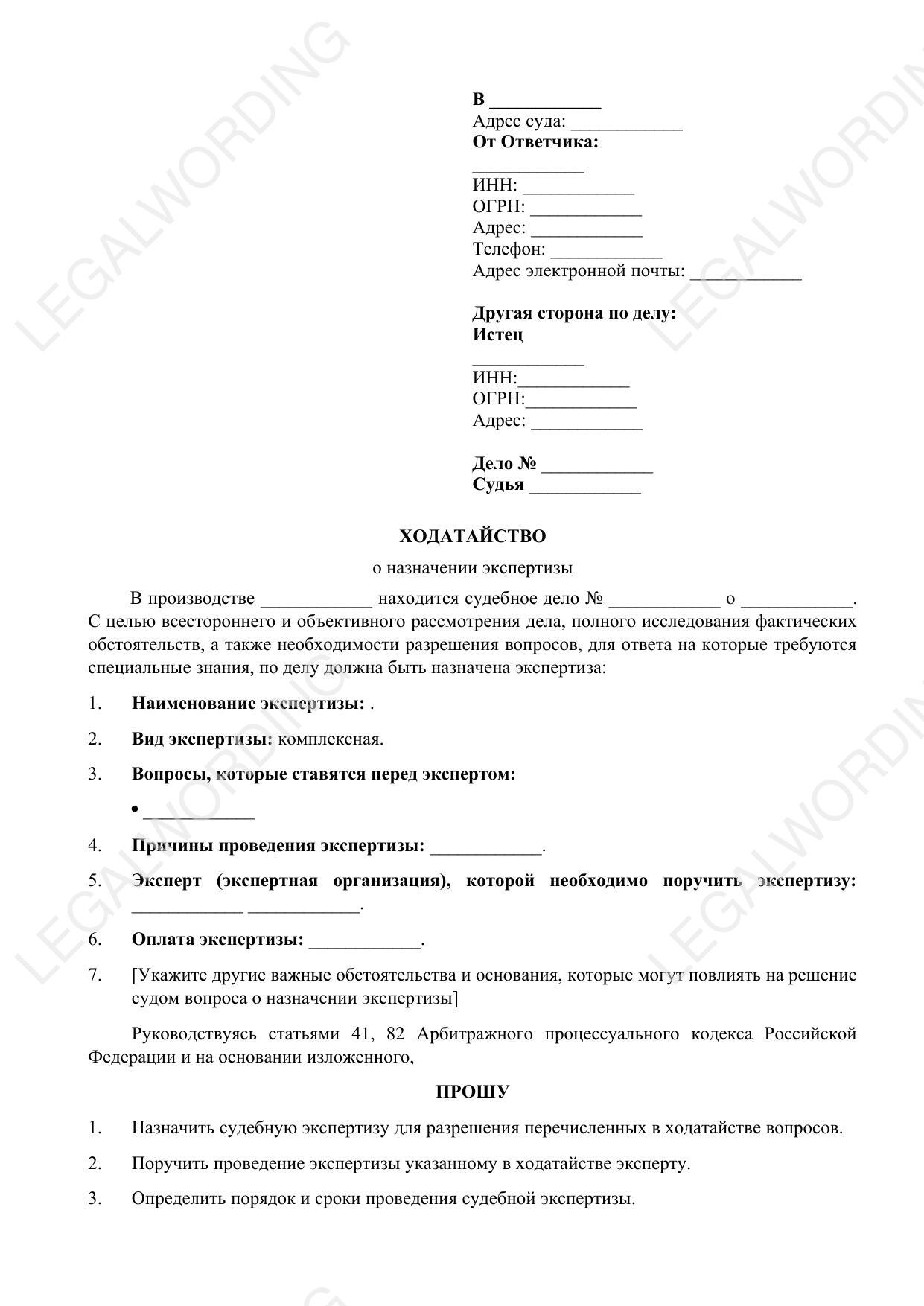 Шаблон ходатайства о назначении экспертизы в арбитражном суде. Документ предназначен для использования юридическими лицами, участвующими в судебных разбирательствах. Шаблон включает важные разделы: