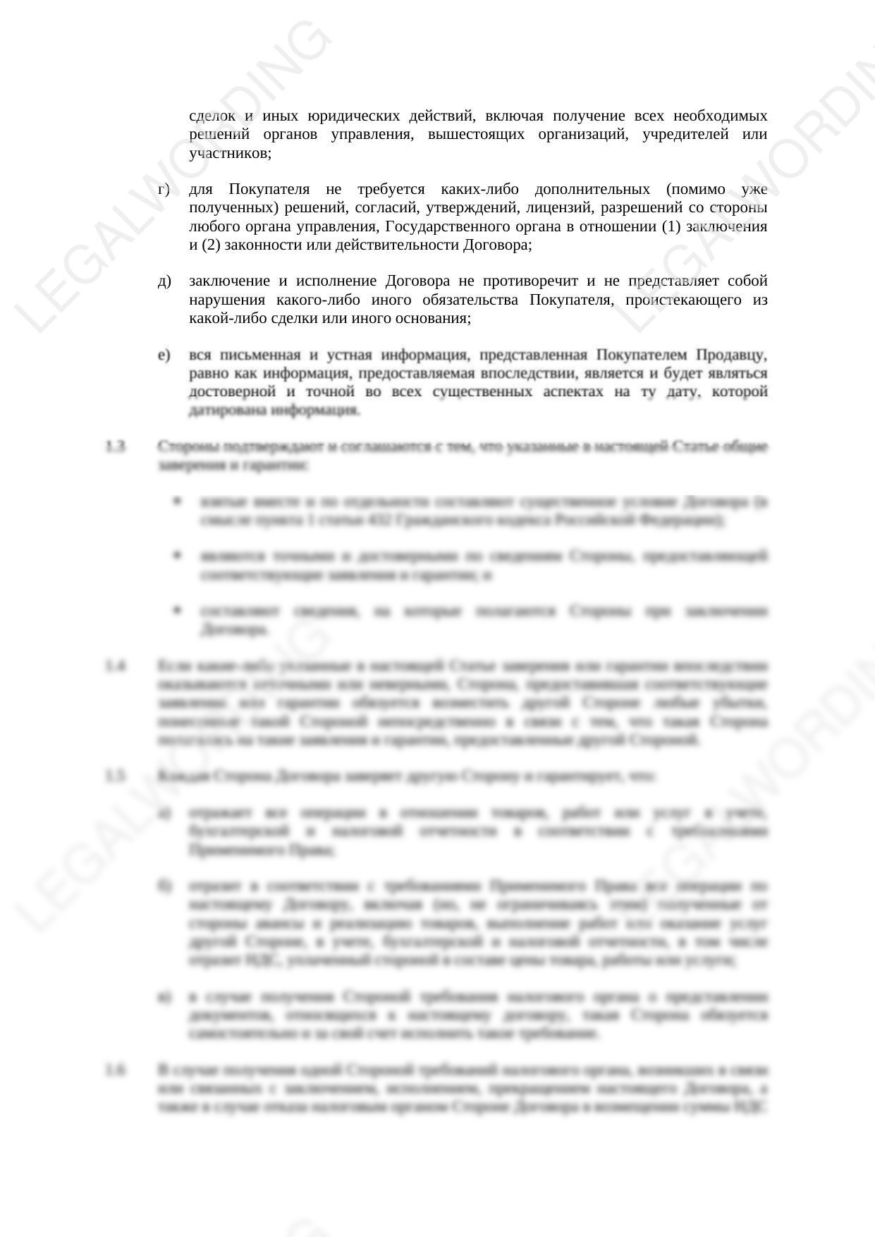 Это не только способствует защите интересов обеих сторон, но и созданию более устойчивых и надежных договорных отношений. Предлагаемая статья может быть использована в договоре купли-продажи и включает как заверения продавца, так и покупателя.