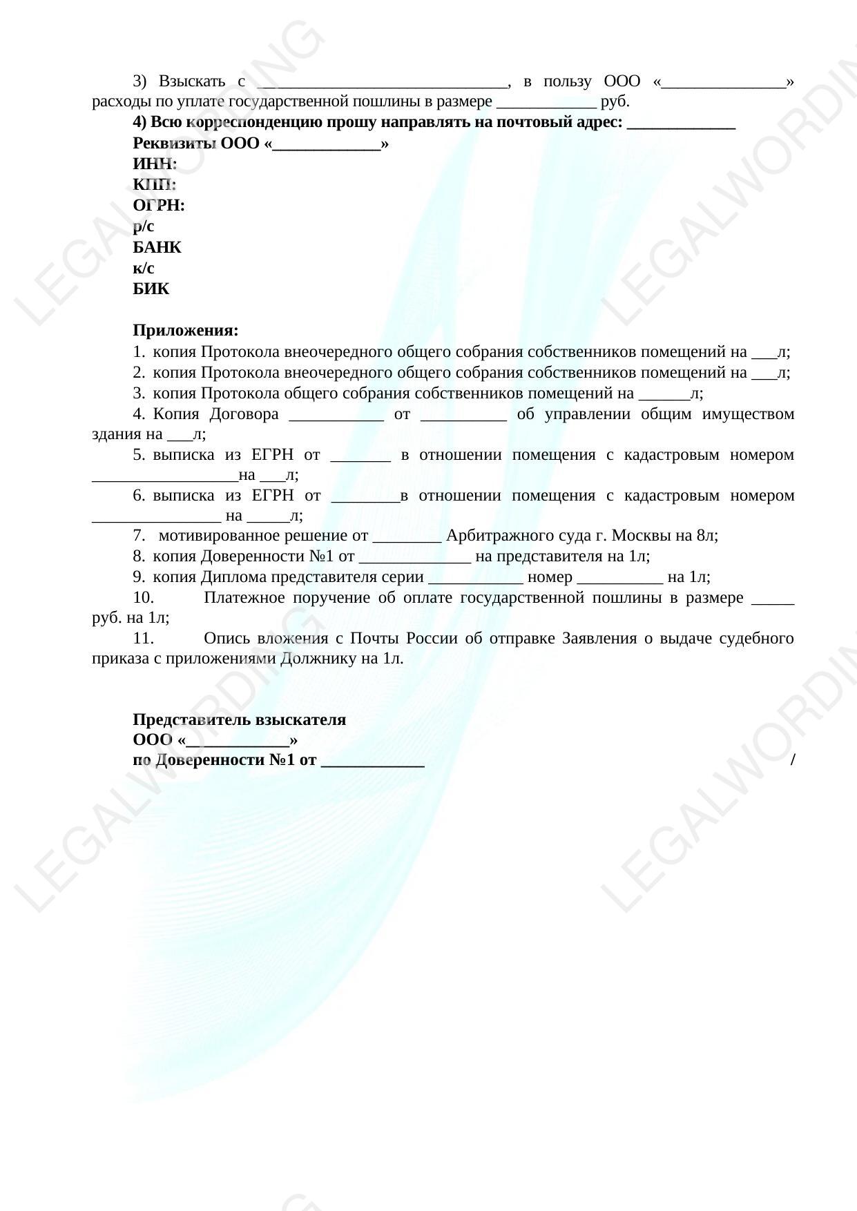 Заявление Управляющей компании в Арбитражный суд к собственнику нежилого помещения о взыскании задолженности за услуги управляющей компании по договору управления общим имуществом и вариант без заключенного договора.