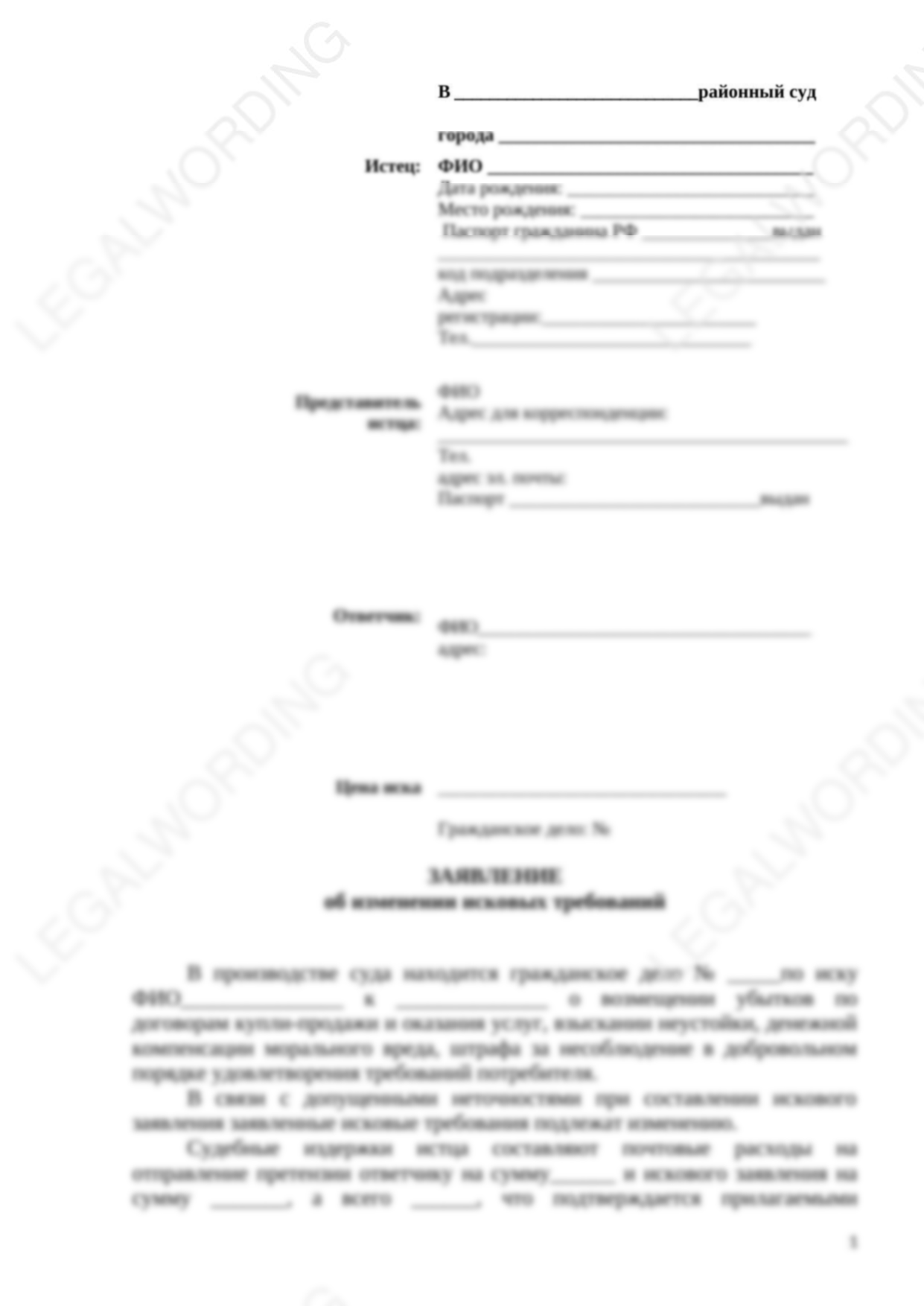 Заявление об изменении исковых требований подается в суд истцом с целью дополнить, уточнить или изменить свои исковые требования. Заявление готово, необходимо внести в него Ваши личные данные.